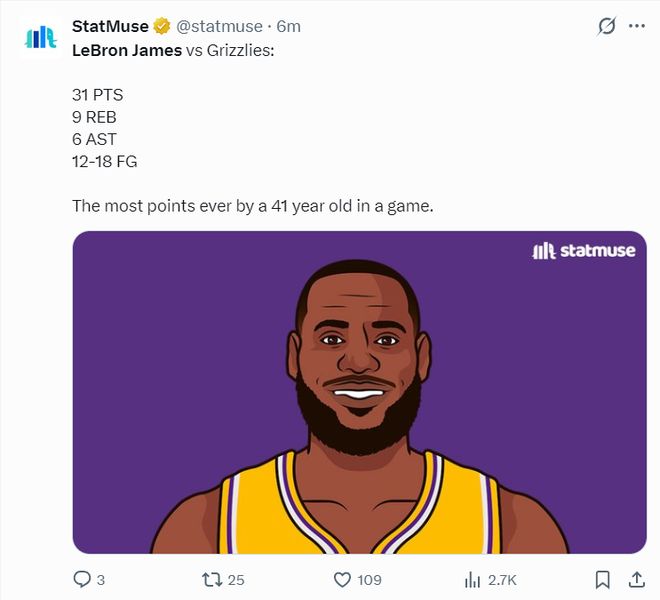 全场比赛,勒布朗36分钟,18中12,罚球6中6,拿到31分9篮板6助攻,命中率66.7%,41岁的詹姆斯拿到30+又刷纪录。