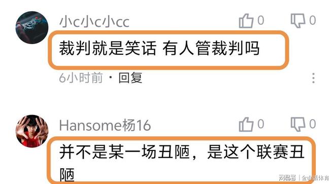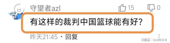 “裁判也真的是尽力了!罚掉山东主帅,罚掉山东主力外援,罚掉两个中锋,给了你那么多罚篮,最后还输十几分!真的丢人!”;“叼着个哨子胡吹,我说心里话”;“克里斯罚下,主教练罚下,陶汉林罚下,郭凯罚下,真牛逼!”;“这主场哨真黑呀!”……