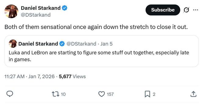 正如湖人记者Daniel Starkand赛后所说:“詹姆斯与东契奇正在适应彼此,他们又一次在比赛收官阶段携手帮助球队锁定胜局。”