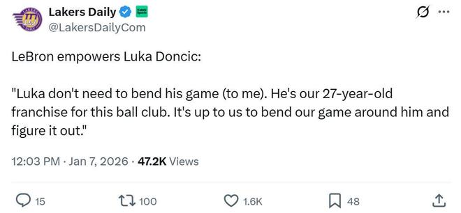 湖人媒体Lakers Daily坦言:“东契奇球迷听到这一番话后,不可能再讨厌詹姆斯了,从球队介绍首发五虎时将东契奇放在最后,到牺牲各方面适应东契奇,勒布朗竭尽全力来提升卢卡的地位。”