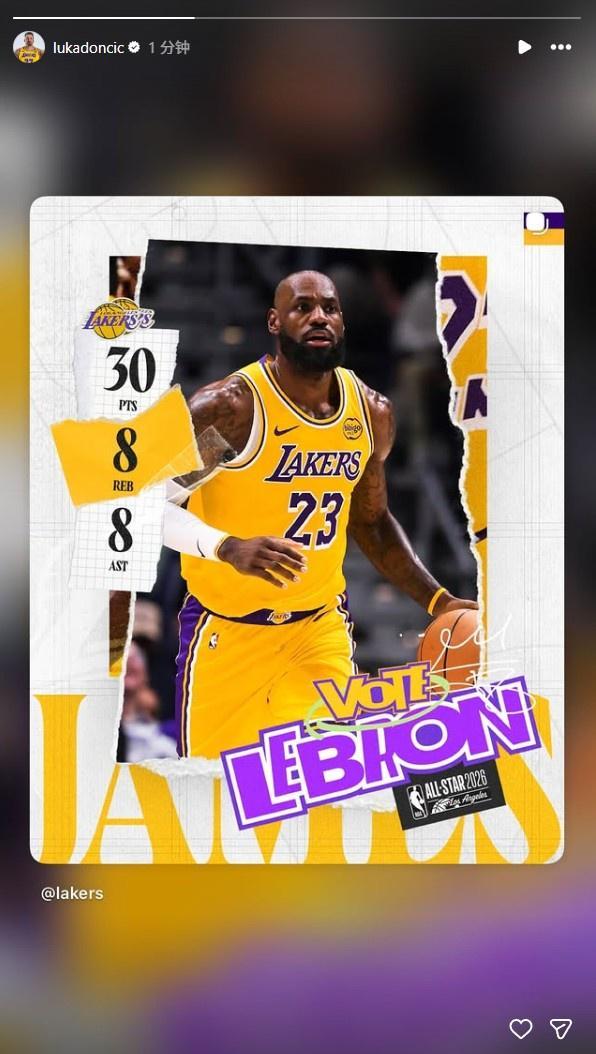 而东契奇也在赛后转发詹姆斯本场数据,对这名41岁老将表达敬意。