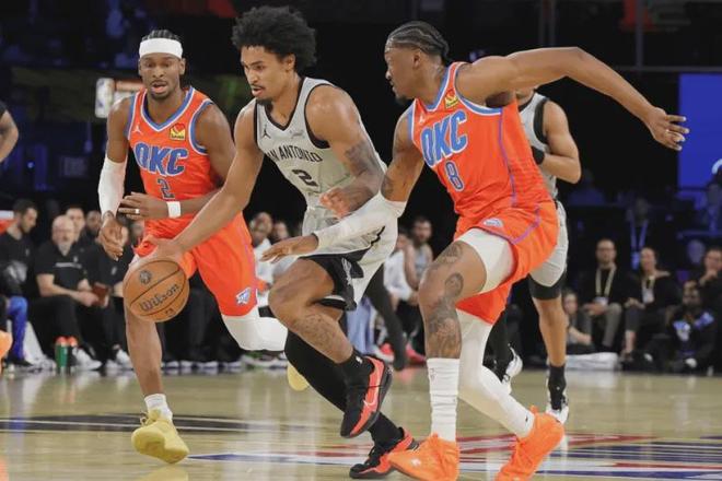 防守端马刺队有文班亚马这个BUG级的联盟最佳防守球员,所以球队防守体系非常容易建立,目前球队防守效率113.1排名全联盟第6,队内所有球员在这个体系中都有防守加成,简单点说,即便第一层外线防守被突破,对手进入内线面对的也是恐怖的文班亚马封盖干扰,马刺队外线防守球员只需紧跟进攻人,不给投篮空间,甚至可以故意把他驱赶到文班亚马的防守覆盖区遭受打击,防守压力相比其他球队减少一个级别.