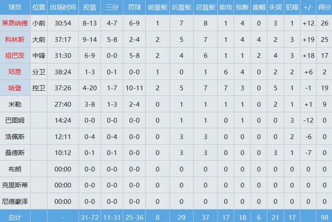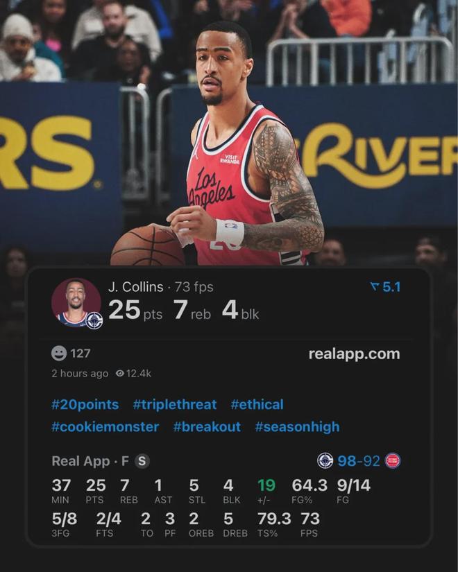 此役科林斯乃快船的最大赢球功臣,首发出战约37分钟,投篮14中9,其中三分球8中5,罚球4中2独揽25分7板1助4断4帽全面数据,正负值+19全场最高。快船队记Azarly对此表示,科林斯是有数据统计以来,首位单场25分&命中5记三分并送出4断4帽的球员。