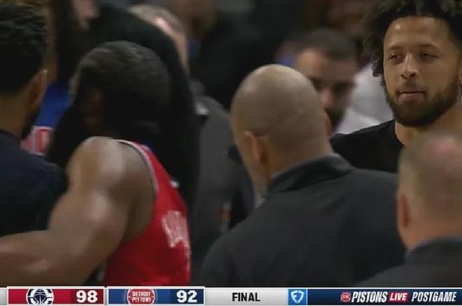 哈登投篮20中4,直接把篮筐砸歪......然而快船还是赢了东部最强球队活塞,客场98-92带走胜利。