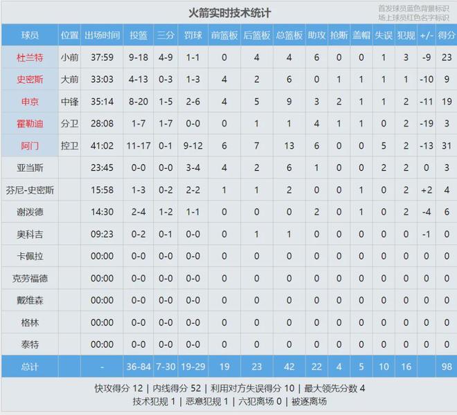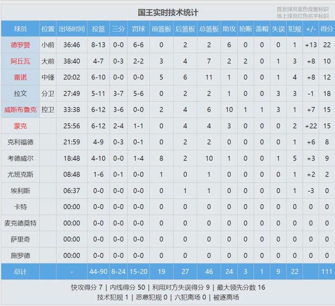 火箭末节崩盘,单节输给国王11分。四节比分如下(火箭在前):23-22、25-29、28-27、22-33。此役过后,火箭22胜14负跌至西部第七,排名被24胜15负的太阳反超。国王结束7连败,9胜30负升至西部倒数第二,鹈鹕9胜32负西部垫底。