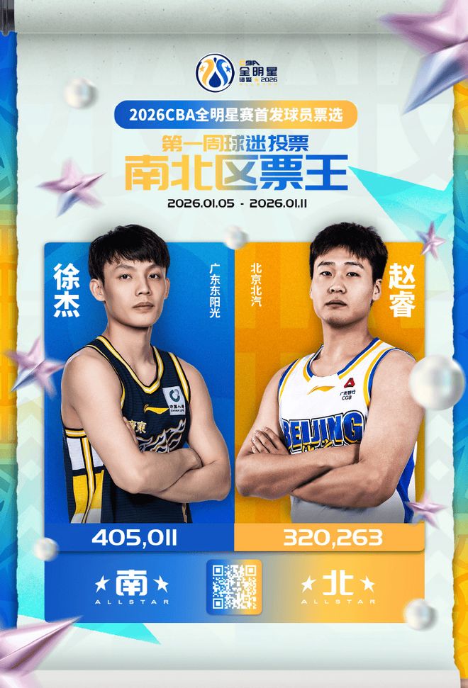 今日,CBA官方分享全明星投票首周结果:徐杰南区票王,赵睿北区票王。