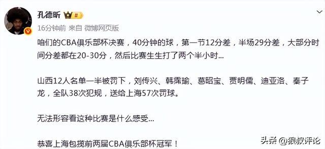 咱们的CBA俱乐部杯决赛,40分钟的球,第一节12分差,半场29分差,大部分时间分差都在20-30分,然后比赛生生打了两个半小时...