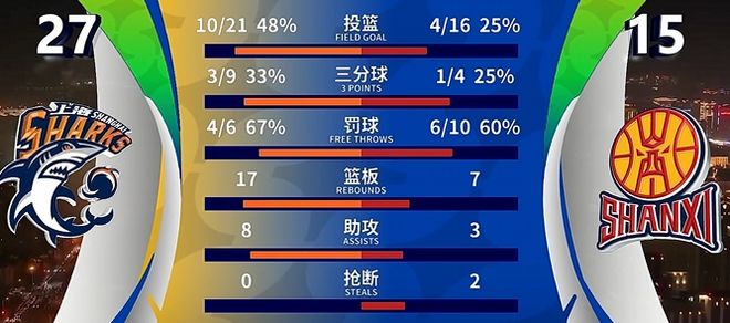 开场后没多久上海男篮就展现出极强的统治力,尤其是替补登场的刘铮,他单节拿到11分,帮助上海男篮在首节就建立起两位数领先优势。【上海男篮 27-15 山西男篮】