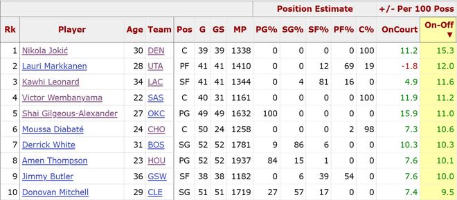 排在第四的文班亚马ON-OFF值为11.2,排在第五的谢伊-吉尔吉斯-亚历山大ON-OFF值为11,两人可谓伯仲之间。文班场均24.4分11.1篮板(联盟第四)2.7盖帽(联盟第一),马刺以38胜16负的战绩位列西部第二,SGA场均31.8分(联盟第二)6.4助攻,雷霆虽然没能打破勇士73胜的常规赛历史胜场纪录,但仍以42胜14负的战绩高居联盟榜首,他们俩进入前五可谓实至名归。