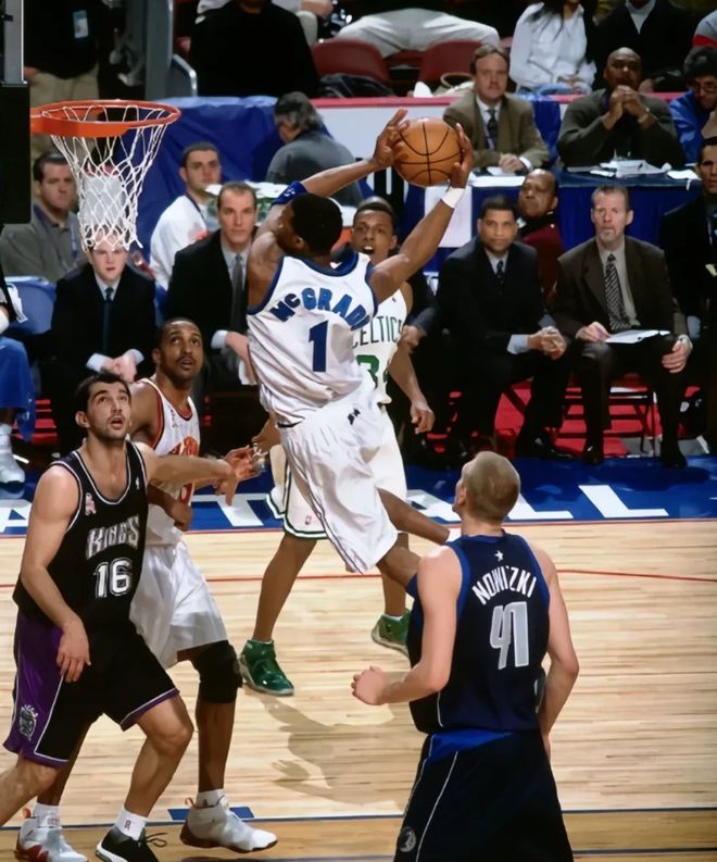 第三位,特雷西·麦克格雷迪。麦迪的巅峰期确实短,满打满算也就魔术那4年,可就是这短短几年,他让全世界见识到了什么是天赋怪的进攻。他是NBA历史上唯一一个,在后卫和小前锋两个位置都入选过最佳一阵的球员,1号位到3号位随便切换,静态天赋、动态天赋全是顶级。