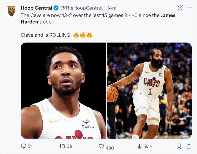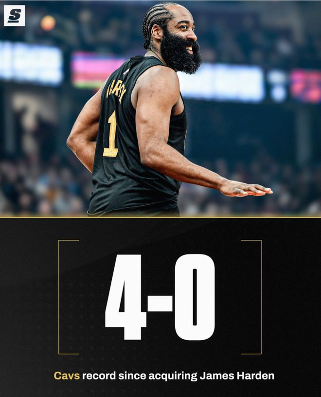 加盟4连胜!哈登三节打卡16+9米切尔露齿大笑 骑士15战13胜真北伐