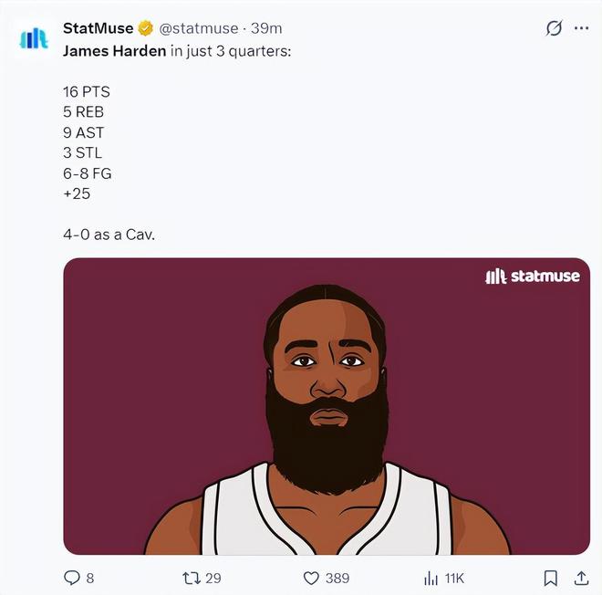 哈登被交易到骑士后的四场比赛:23+8、22+7、13+11、16+9,他是同期助攻数最多的那个,他在骑士打控球后卫时骑士的进攻非常流畅。