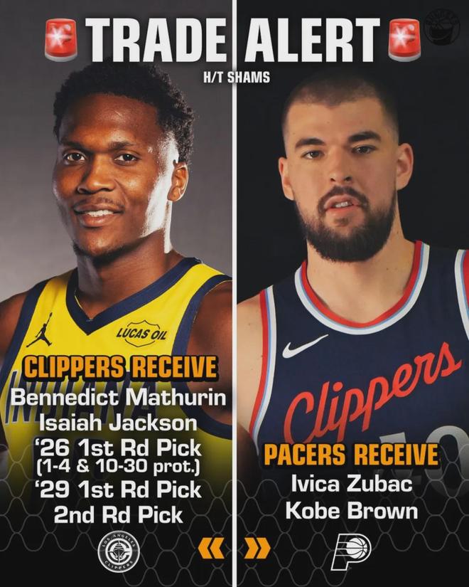 这两个首轮签分别是:2026年首轮签(如果是前4或者10-30顺位,步行者保留,如果是第5-9顺位则属于快船),以及2029年无保护首轮签。倘若2026年首轮没有兑现,将变成2031年无保护首签。总之,快船一定能拿到2个首轮!