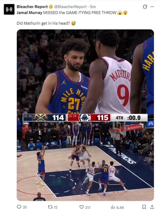 美媒:穆雷今年关键时刻的罚球都不佳,这场比赛他让剧情发生了匪夷所思的转折。