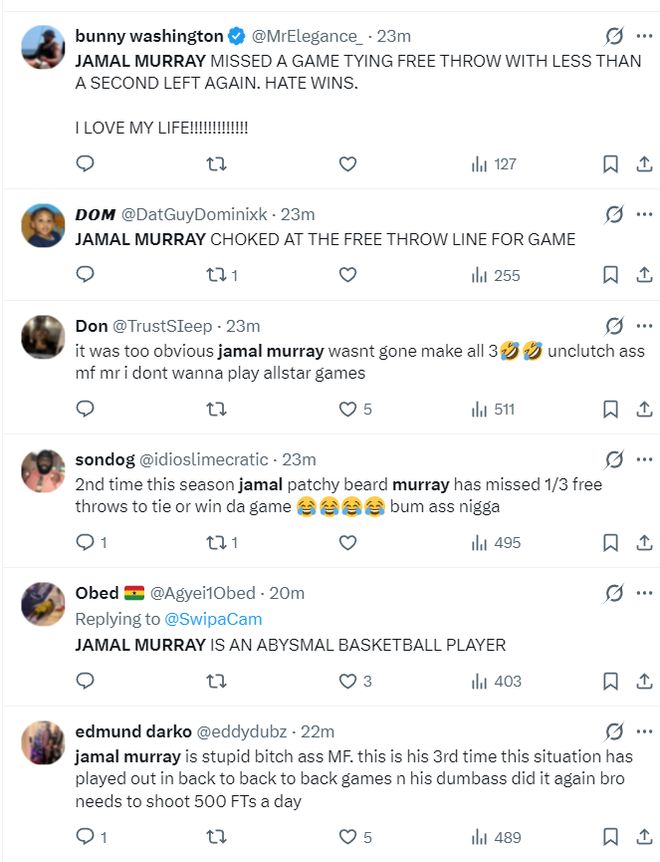 1.我觉得也不该全怪穆雷,三届MVP约基奇表现也很差,他在故意搞破坏,他也是NBA的一个耻辱;