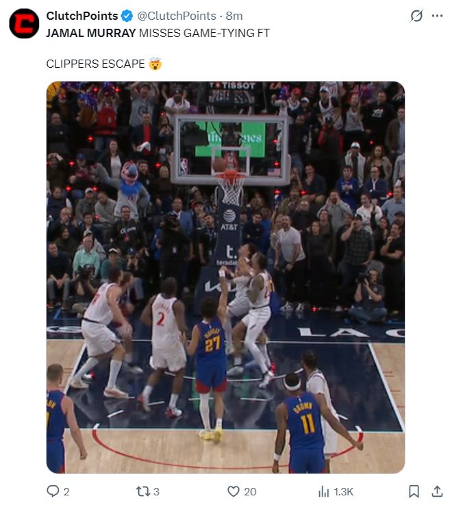 美媒:穆雷错失扳平比分的罚球,快船逃过一劫。
