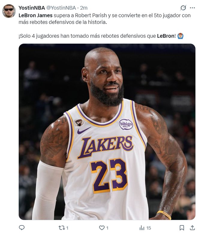 数据媒体写道:詹姆斯的防守篮板超越帕里什升至历史第五,历史上只有4人的防守篮板比他多。