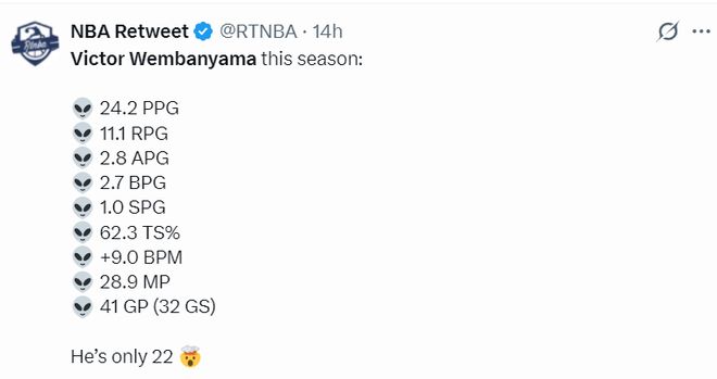 本赛季文班亚马场均28.9分钟,拿到24.2分11.1篮板2.8助攻1抢断2.7盖帽,命中率51.1%,三分命中率35.7%,真实命中率62.3%,BPM值+9。