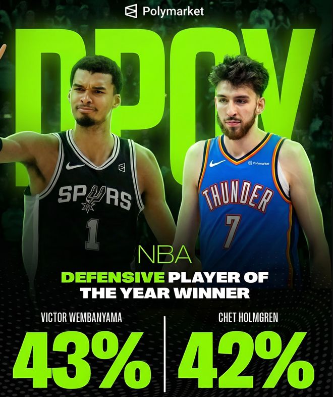 文班亚马本赛季拿到最佳防守球员的概率为43%,而霍姆格伦本赛季拿到最佳防守球员的概率为42%,这两人大概率都会入选最佳防守阵容,甚至两人都会入选最佳一防。