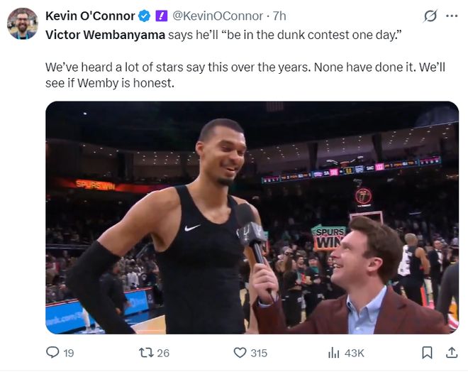 赛后文班亚马谈到自己的抡臂大风车,他表示自己未来有朝一日肯定会参与全明星扣篮大赛。