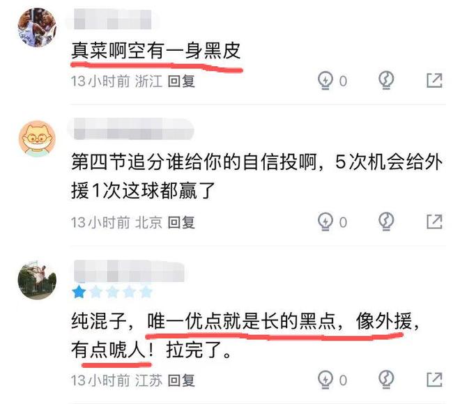 面对罗凯文、宁鸿宇这几位八一出品的前锋,祝铭震这场可以说是直接拉了坨大的。全场首发出战27分钟的他,投篮6中0(三分球5中0),仅靠罚球拿到4分,末节最后时刻,如果祝铭震把握住了那记空位三分球,同曦说不定真的能够改变比赛结局。祝铭震的拉胯,也引来了球迷的热议:“纯混子,唯一有点,就是长得黑点,像个外援,有点唬人。”