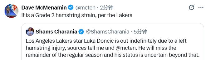 北京时间4月4日,名记Shams报道称,湖人球星东契奇因左腿筋伤势无限期缺阵。他将缺席本赛季剩余所有常规赛,此后的出战状态目前仍无法确定。随后湖人官方宣布,东契奇确诊为腿筋二级拉伤。此前医学专家表示,一级拉伤需要1-2周康复,若是二级拉伤就要3-6周。