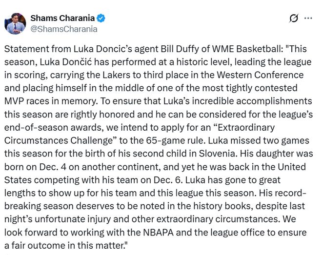 东契奇的经纪人比尔-达菲发表声明:“本赛季,卢卡-东契奇打出了历史性表现,他领跑联盟得分榜,带领湖人稳居西部第三,也让自己置身于记忆中竞争最激烈的MVP角逐之中。为了确保卢卡本赛季取得的辉煌成就得到应有的认可,并让他有资格参评联盟赛季末各项奖项,我们将就65场出战规定向联盟申请‘特殊情况豁免’。”