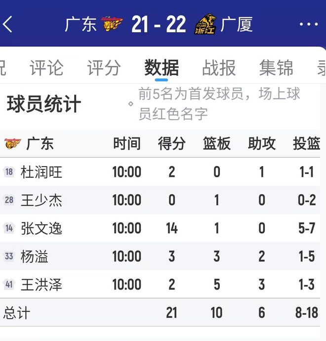 杜润旺本赛季表现一直很低迷,主要还是受肩膀伤病的影响,但让人有些无法理解的是,杜锋对于杜润旺一直有一种过分的偏爱,正赛打不好,没关系,潜力赛接着打,正赛广东赢了广厦20分,赛后的潜力赛环节,广东队派出杜润旺、王少杰、张文逸、杨溢、王洪泽参战,张文逸拿到了14分,而杜润旺只1中1拿到2分,广东队21-22惜败广厦,潜力赛7连胜被广厦终结。