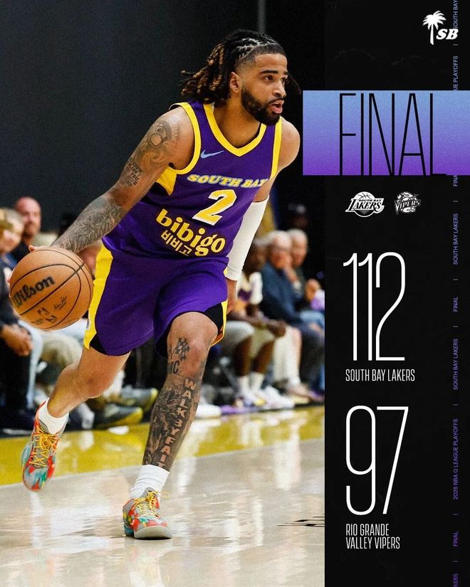 两天前结束的一场G联赛,南湾湖人112-97轻松战胜奥格兰德河谷毒蛇(休斯顿火箭下属球队)。