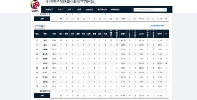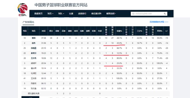 本场数据方面,广东队与山东队的助攻比为25-22、篮板比为33-39、失误比为11-13、投篮命中率则为41.5%-53.8%,三分命中率是32%-44.4%。显然广东男篮本场输在了进攻效率和外线投射上。