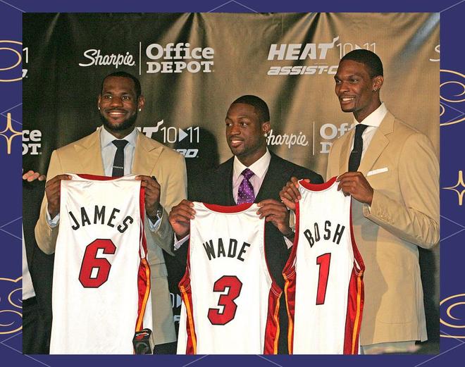 2010年詹姆斯在波什加盟热火不久便高调宣布加盟迈阿密热火,开启抱团夺冠的先河。詹姆斯再2003年到2010年之间效力克利夫兰骑士,在这7个赛季,詹姆斯拿下2座MVP奖杯,但球队始终无法突破凯尔特人等强队的封锁,未能如愿收获总冠军奖杯。