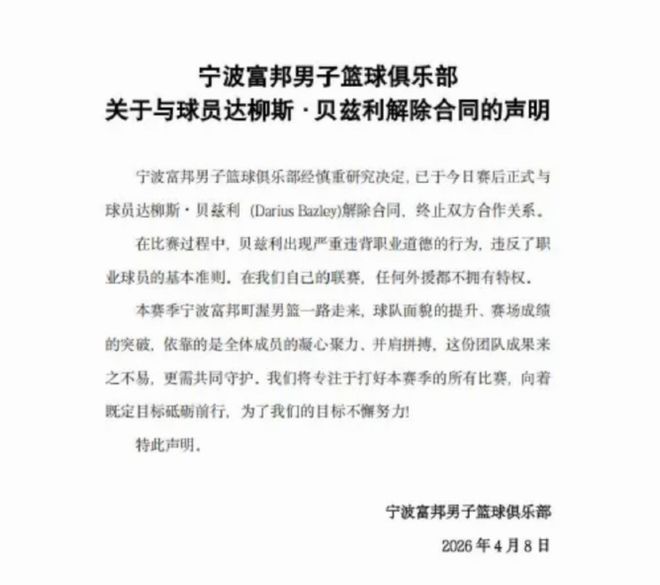 这一下“内讧”成了导火索,宁波男篮在比赛结束之后立即发了公告,宣布跟贝兹利解约。