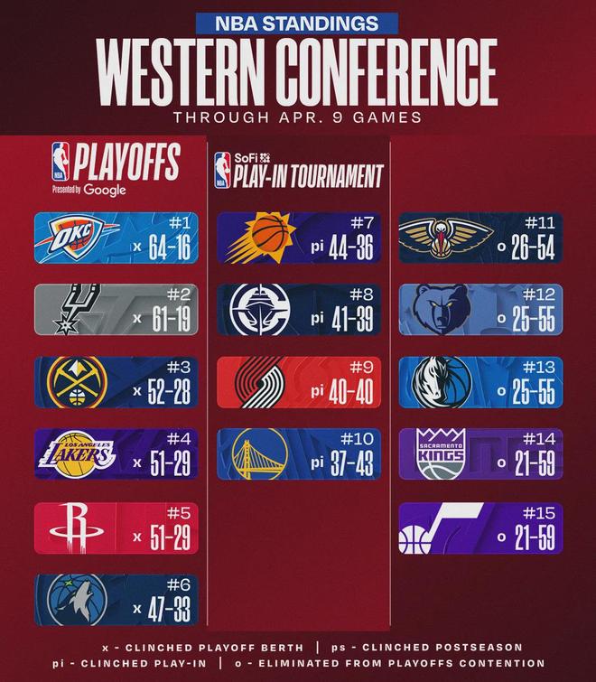 湖人明天背靠背打太阳,常规赛收官打西部垫底的爵士。为了全力备战附加赛,布克已经确定明天不打,杰伦-格林出战成疑。这样一来,湖人拿下最后两场问题不大。掘金收官战硬刚马刺,如果掘金输给马刺的话,就会跌至第四。