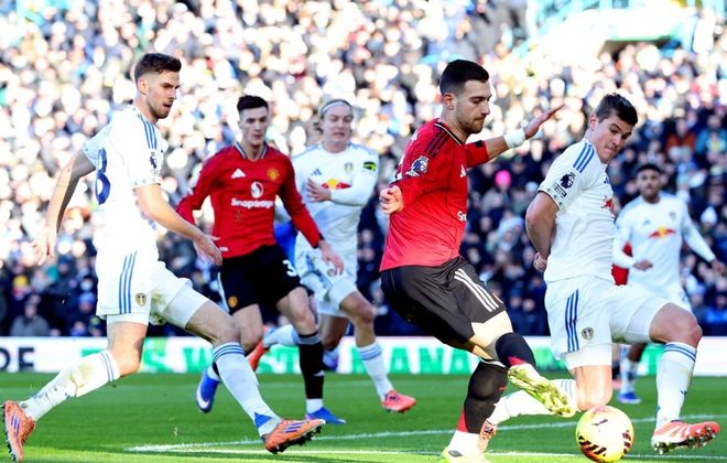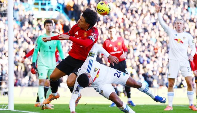 下半场易边再战。第51分钟,古德蒙松在禁区右侧凌空爆射,打近角。门将封死了角度,把球扑出了底线。随后,乌加特在禁区线上横向盘带后起脚射门,踢偏了。第62分钟,曼联丢球了。斯特鲁伊克送出妙传,阿伦森前插,抢在后卫之前,得到皮球,顺势把球带进禁区,推射远角,球进了!利兹联取得领先。