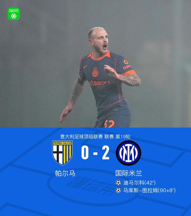 北京时间1月8日,意大利足球顶级联赛第19轮,帕尔马主场迎战国际米兰。比赛中,迪马尔科接队友传球后冷静施射破门,为国际米兰先拔头筹。随后在下半场补时阶段,巴雷拉送出精准助攻,马库斯-图拉姆抓住机会再下一城。最终,国际米兰以2比0战胜帕尔马。