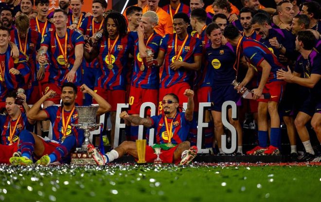 1月12日。巴萨在西超杯决赛3比2击败皇马夺冠,下半场还被红牌罚掉德容,但不妨碍他们坚挺到最后。巴萨这场比赛还一如既往被裁判亏待,但在纸面阵容并没有绝对占优的情况下,依旧笑到最后,拉菲尼亚和加西亚在攻防两端撑场面,莱万也进球并激活两个里程碑——榜首都是梅西、历史第一。