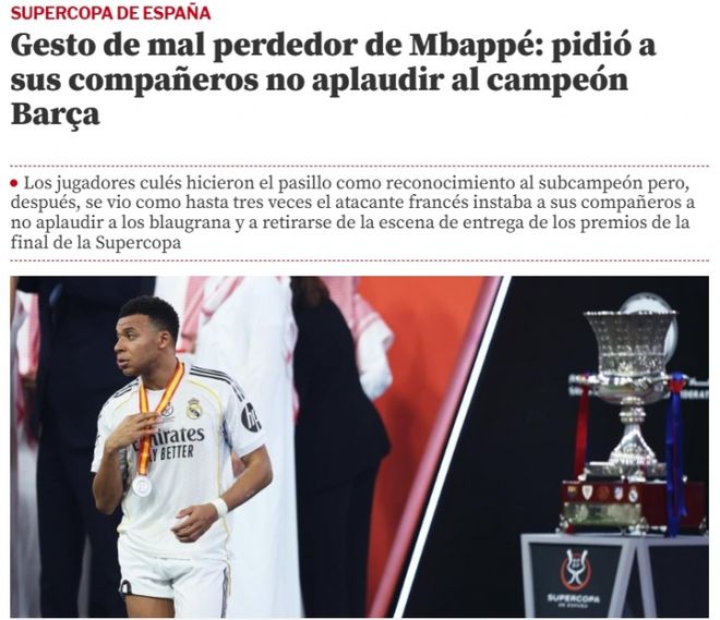 西班牙媒体《世界体育报》报道,姆巴佩在赛后对巴萨非常不友好,而且显得自己没格局。世体指出姆巴佩多次要求皇马队友们不要给巴萨鼓掌,巴萨作为冠军还给皇马领银牌列队,但姆巴佩没风度地阻止皇马给巴萨鼓掌,要求所有人离开颁奖典礼现场。这不只是报道,还有视频。另一个西班牙媒体《阿斯报》晒出赛后现场视频,皇马球员在巴萨领奖的时候站在边线,等巴萨捧杯后,他们匆匆离开,像极了牛马踩点打卡。