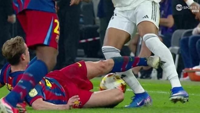 第90+1分钟,巴萨仍以3比2领先,比赛仅剩几秒钟即将结束。此时,巴萨中场弗兰基·德容对皇马前锋基利安·姆巴佩做出一次激烈铲抢——他高抬脚底,鞋钉直接踢中姆巴佩的小腿部位。