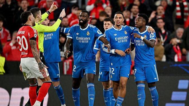 维尼修斯再遭攻击:比赛临近结束时,他还在边线附近被本菲卡球迷看台投掷的异物击中,进一步加剧了紧张局势。