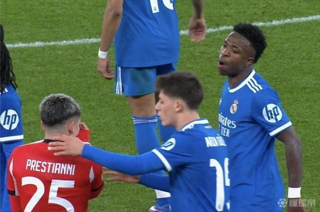 在欧冠淘汰赛附加赛首回合皇马客场挑战本菲卡的比赛中,维尼修斯在破门后与本菲卡球员发生了冲突,在维尼修斯与本菲卡球员普雷斯蒂安尼发生口角的过程中,普雷斯蒂安尼用球衣捂嘴并喋喋不休,随后维尼修斯向主裁判投诉自己遭遇普雷斯蒂安尼种族歧视并拒绝继续比赛,主裁判随即做出反种族歧视手势暂停比赛,比赛因此也暂时中断接近八分钟。
