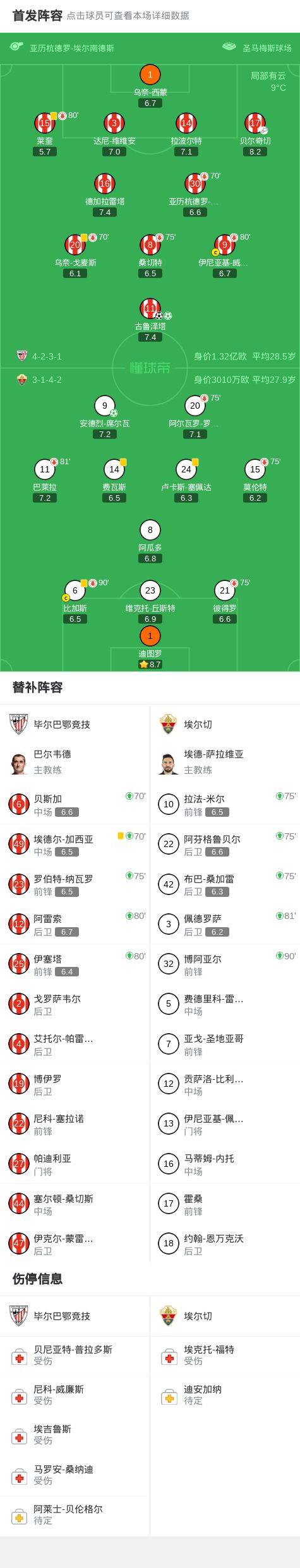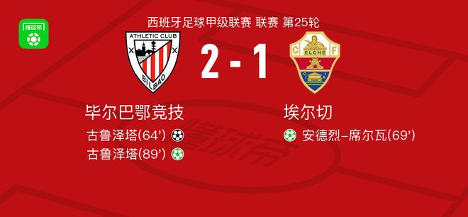 北京时间2月21日西班牙足球甲级联赛 联赛 第25轮,毕尔巴鄂竞技主场对阵埃尔切。毕尔巴鄂竞技古鲁泽塔梅开二度。埃尔切安德烈-席尔瓦破门。最终比分毕尔巴鄂竞技 2-1 埃尔切。