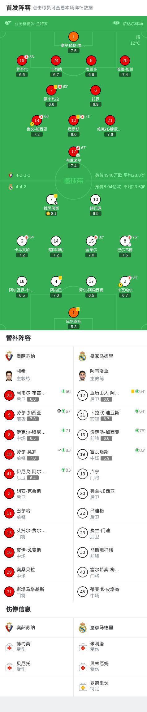 第38分钟,库尔图瓦出击送点,布季米尔操刀命中,皇马0-1!