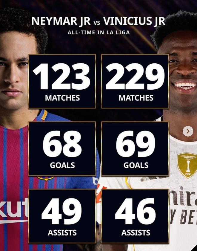 北京时间2月21日,环球足球奖官方对比了内马尔和维尼修斯两代巴西天才球星生涯西甲联赛的数据对比。