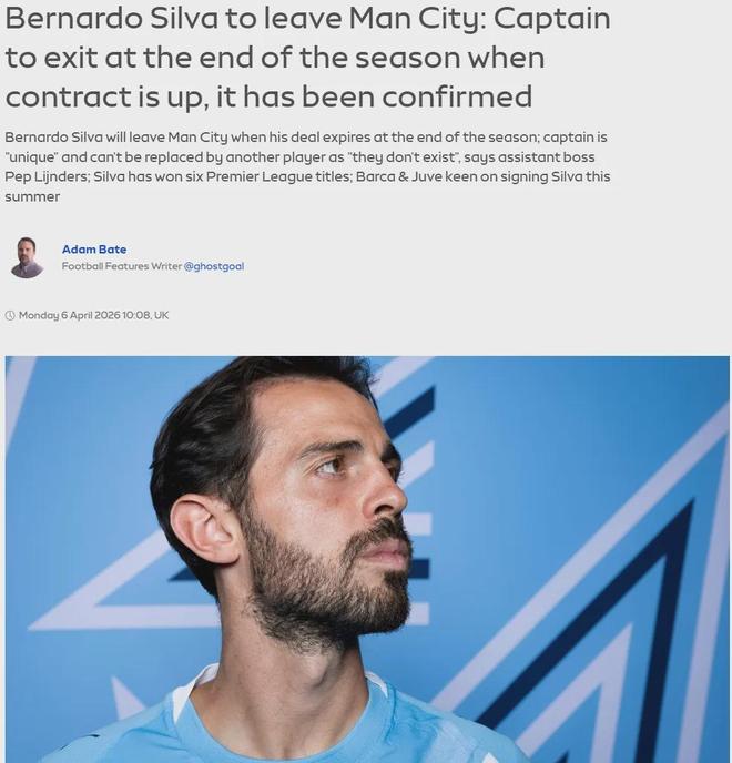 天空体育消息,曼城队长贝尔纳多-席尔瓦将在本赛季结束后离队,这名31岁的球星在效力曼城9年间已经随队赢得过6个英超冠军以及1个欧冠冠军,但他将在本赛季结束合同到期后自由转会。