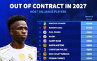 德转列合同2027年到期球员身价榜:维尼修斯、萨卡、福登前三
