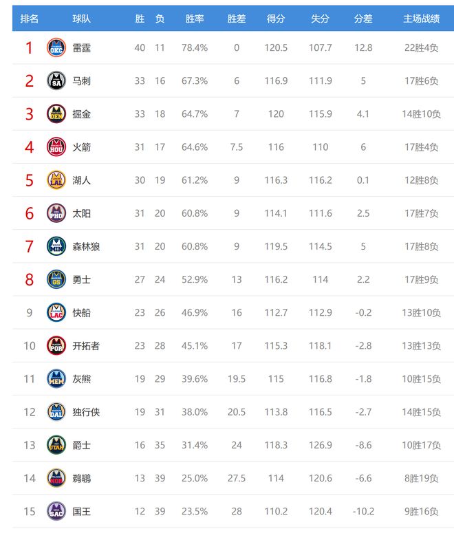 雷霆赢球后2连胜,战绩40胜11负,高居联盟第一。