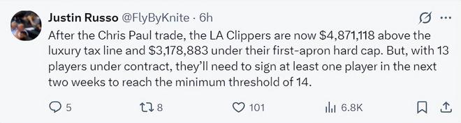跟对于快船来说送走保罗利好太多了,保罗的交易完成后,快船的总薪资超出奢侈税线4871118美元低于硬帽3178883美元,快船目前保障名单只有13份,球队需要在两周内签下一人满足联盟最低14份保障名单的最低门槛。