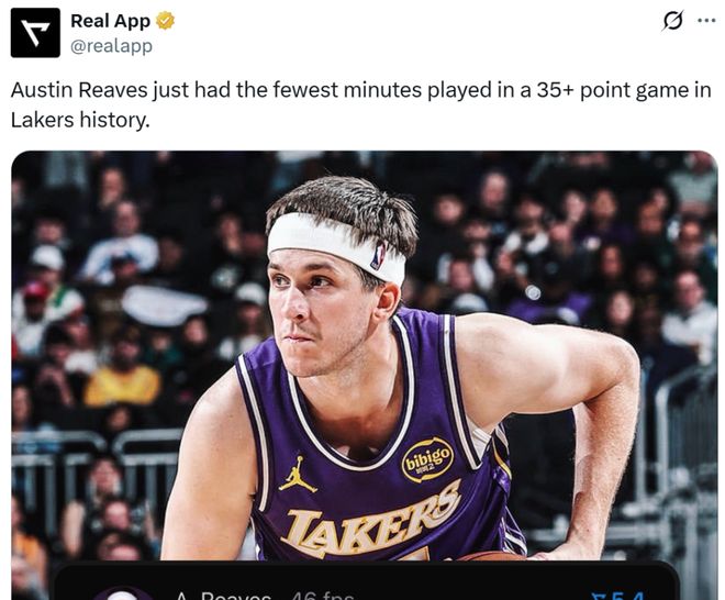 凭借这样的表现,里夫斯成为湖人队史单场拿下35+得分用时最少的球员。