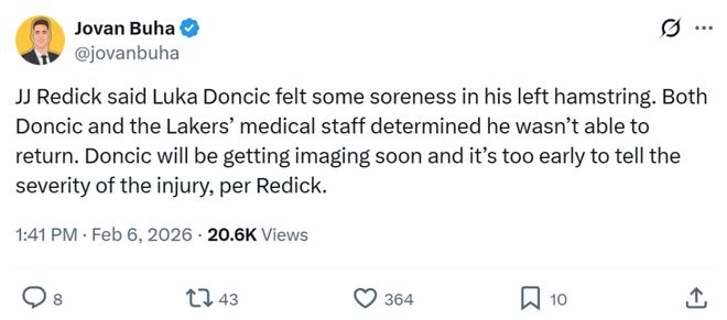 湖人官方也在半场结束时确认消息真实性,指出东契奇因腿筋酸痛本场将不会回归,确定缺席下半场的争夺。