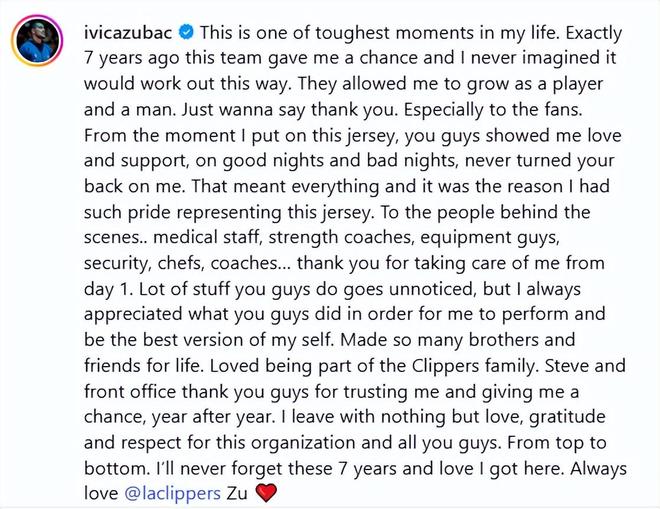 这是我人生中最艰难的时刻之一。整整七年前,这支球队给了我机会,我从未想过会以这样的方式结束。他们见证了我从一名球员到一个男人的成长蜕变。千言万语,唯有感谢。尤其要感谢球迷们。从我披上这件球衣的那一刻起,无论顺境逆境,你们始终对我倾注爱意与支持,从未离弃。这份情谊重于一切,也是我身披快船战袍时,心中满溢自豪的源泉。